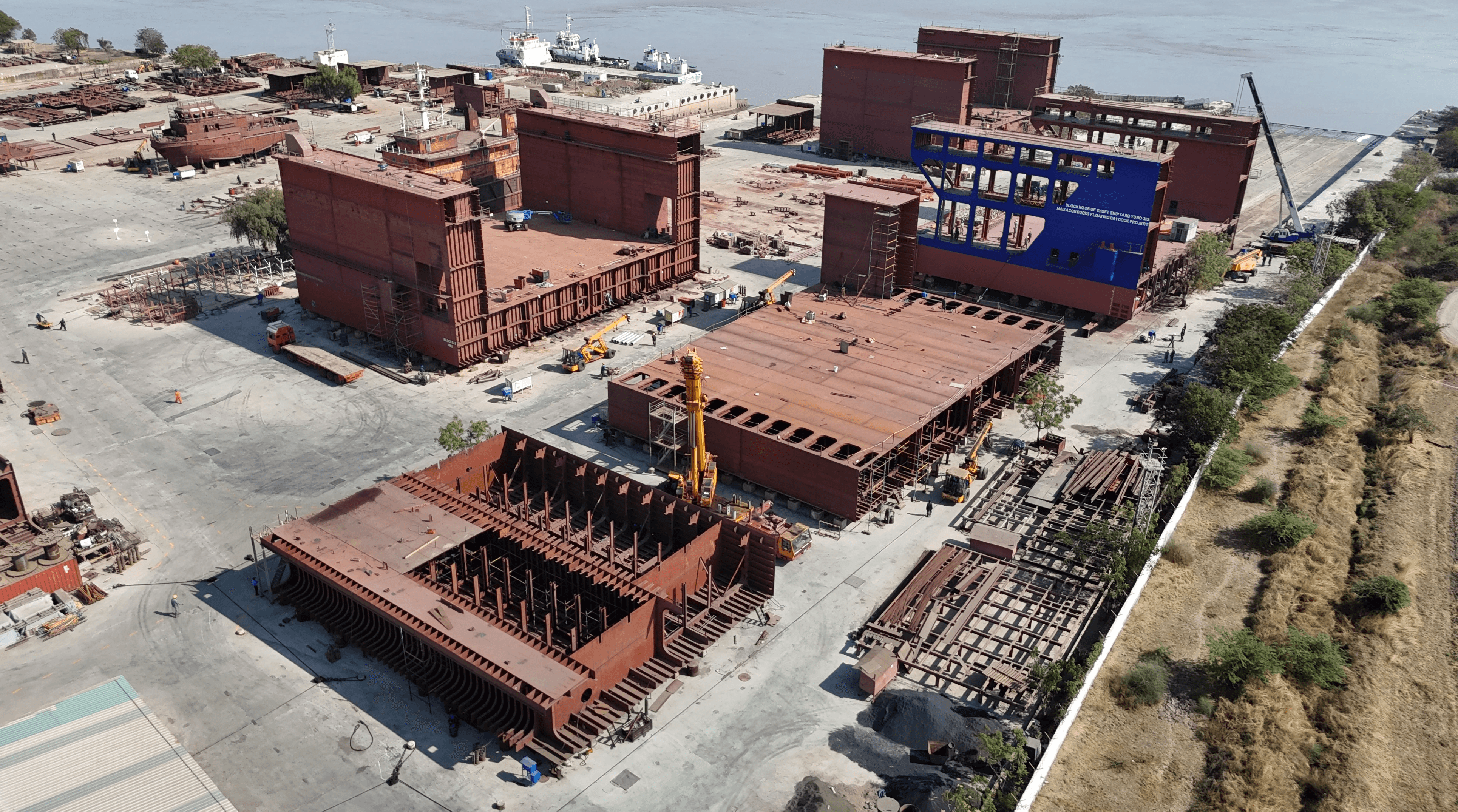 The first Indian shipyard to build a 180m x 44m x 19.5m floating dry dock for vessels up to 12,000T displacement and 9m draft. Modular sections are constructed at Bharuch Shipyard, then launched and towed 200 nautical miles for assembly. Delivery: March 2026.